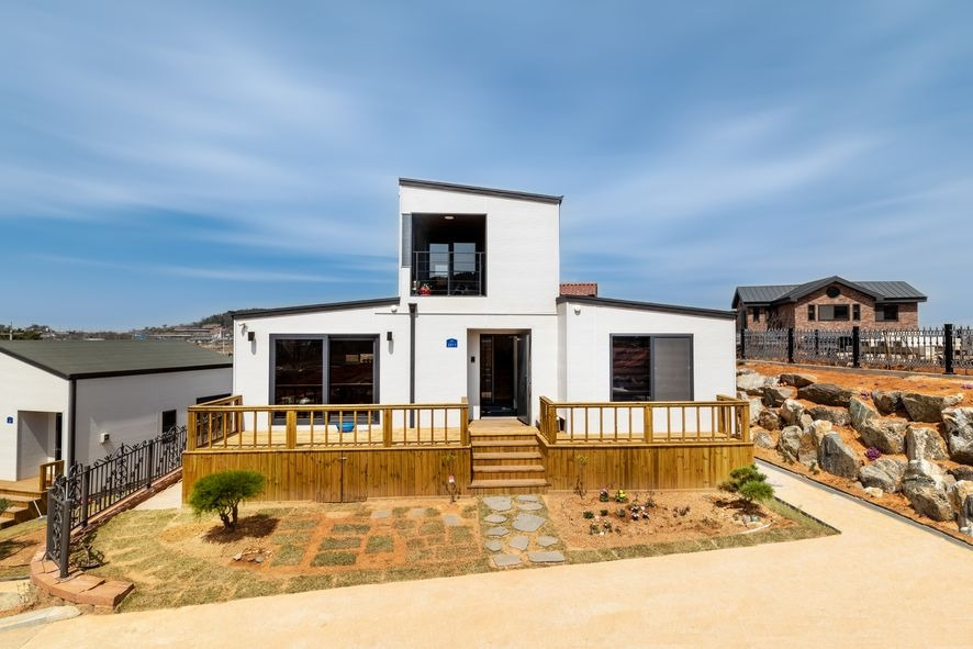 따스한 데크 위에 놓인 이번 전원주택시공 사례에는 특별한 점이 있습니다. 바로 밑에 벽돌을 덧댄 것인데요, 이런 세심한 디테일 하나의 변경만으로도 분위기가 확 달라질 수 있는 것이 전원주택의 매력 중 하나입니다. 건축주님의 각별한 노력이 깃든 이번 전원주택시공 사례는 화이트한 단층 위에 정갈하게 놓인 모듈 하나가 그 포인트가 되어주고 있습니다.