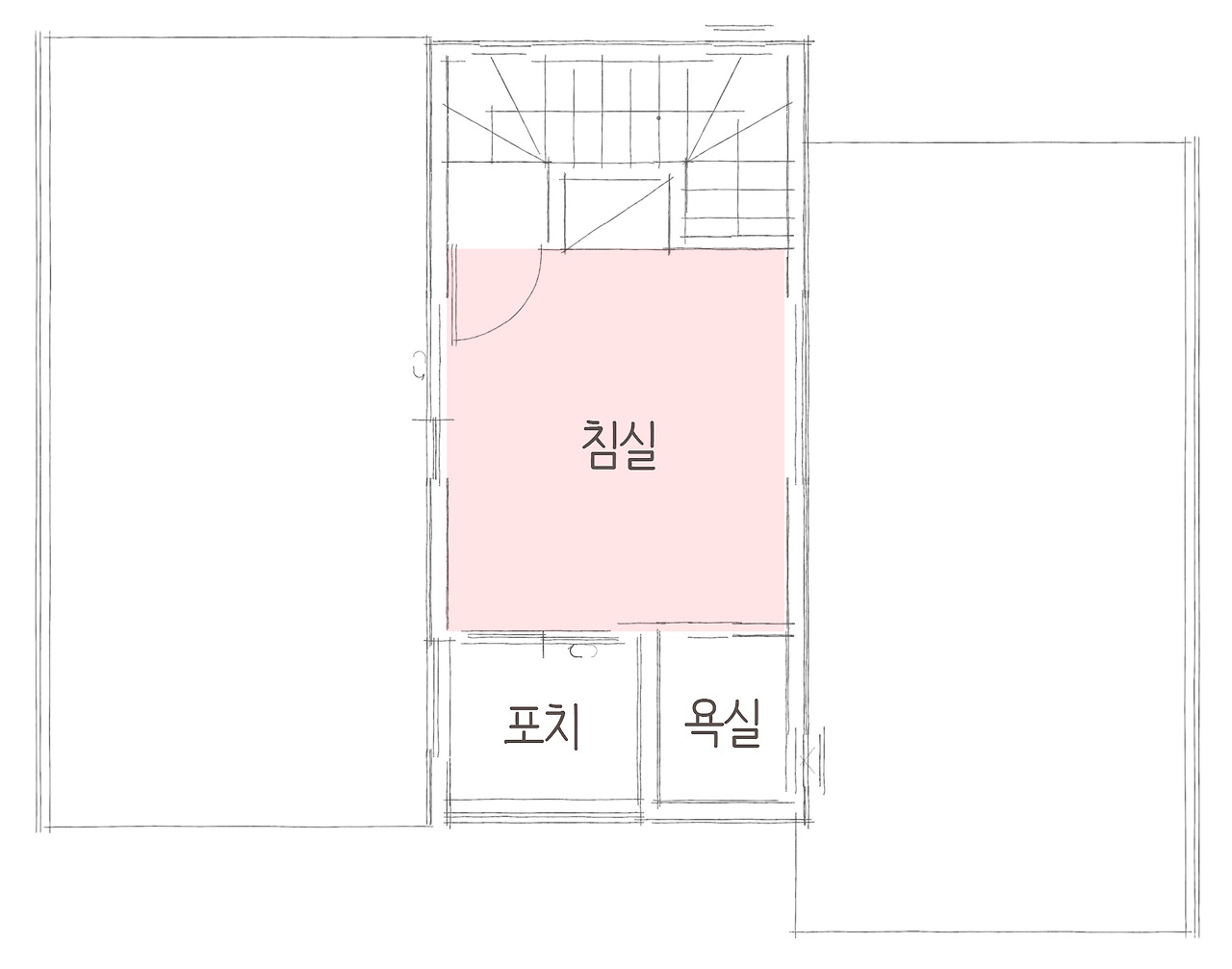 1층의 침실 공간도 고즈넉한 분위기를 위하여 침실 벽면에 큰 창으로 자연광과 더불어 채광과 조망을 확보하였습니다. 수수하고 마음이 편안해지는 공간 덕에 침실에서는 자연스레 휴식의 참맛을 느낄 수 있도록 시공하였습니다.