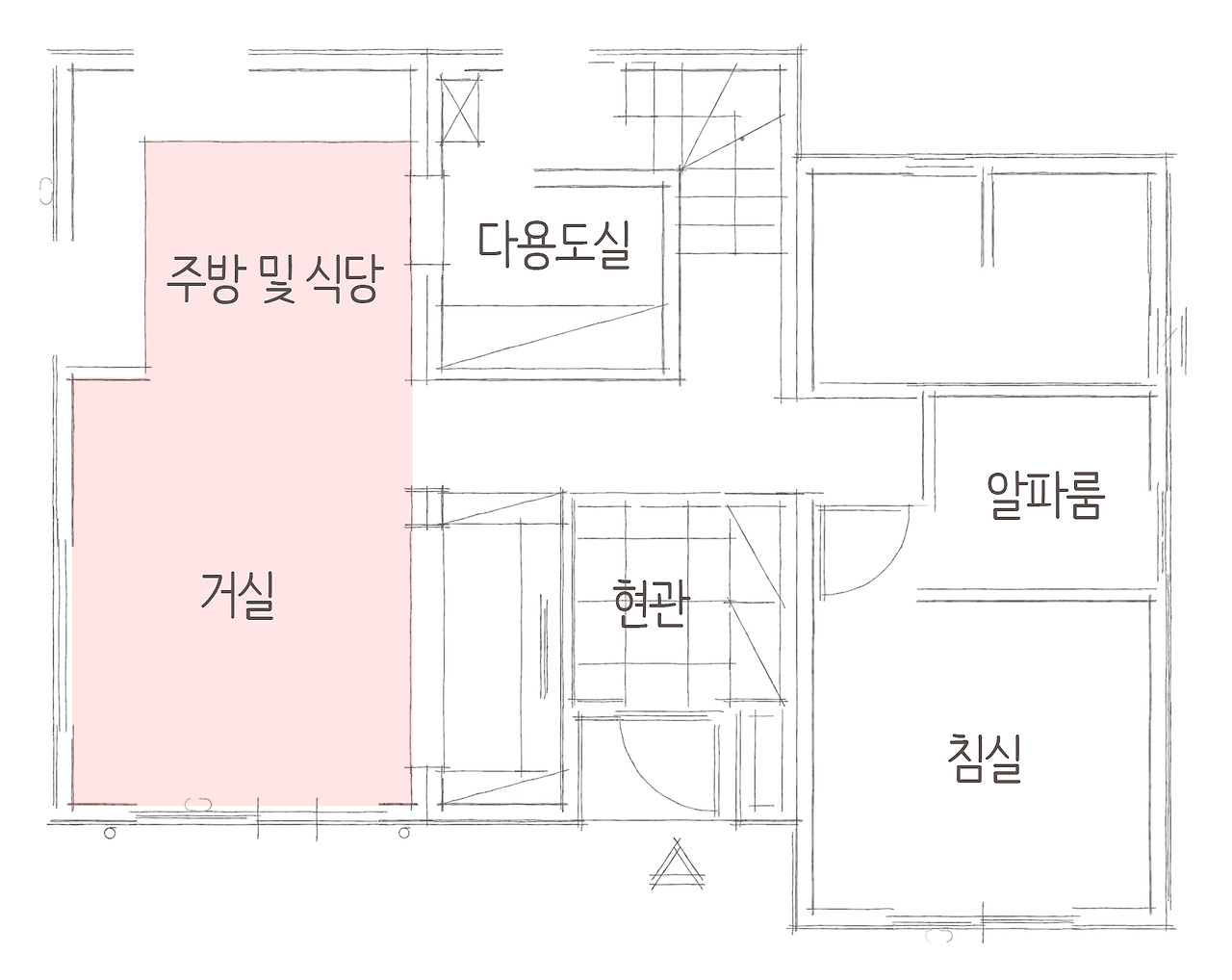 현관을 들어오면 좌측에 거실과 주방 및 식당이 이어집니다. 거실과 주방 공간을 분리하지 않고 연결하여 공간의 확장을 하였으며, 공간을 많이 나누지 않고 공용 공간을 최대한 활용하여 개방감을 주도록 설계하였습니다.