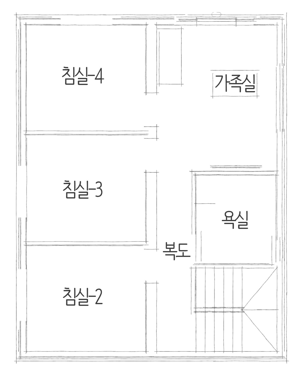 2층은 휴식만을 위하여 설계하여 침실 3개와 가족실 그리고 욕실로 마무리 지었습니다. 1층이 가족 모두의 공용 공간과 소통의 공간이라면 2층은 개인의 공간에서 충분한 휴식을 취할 수 있도록 시공하였습니다.