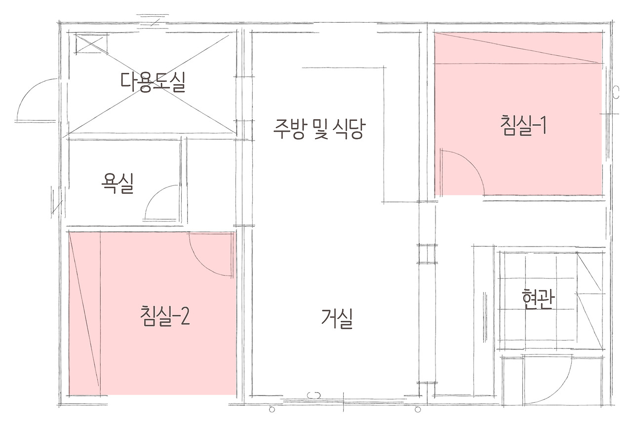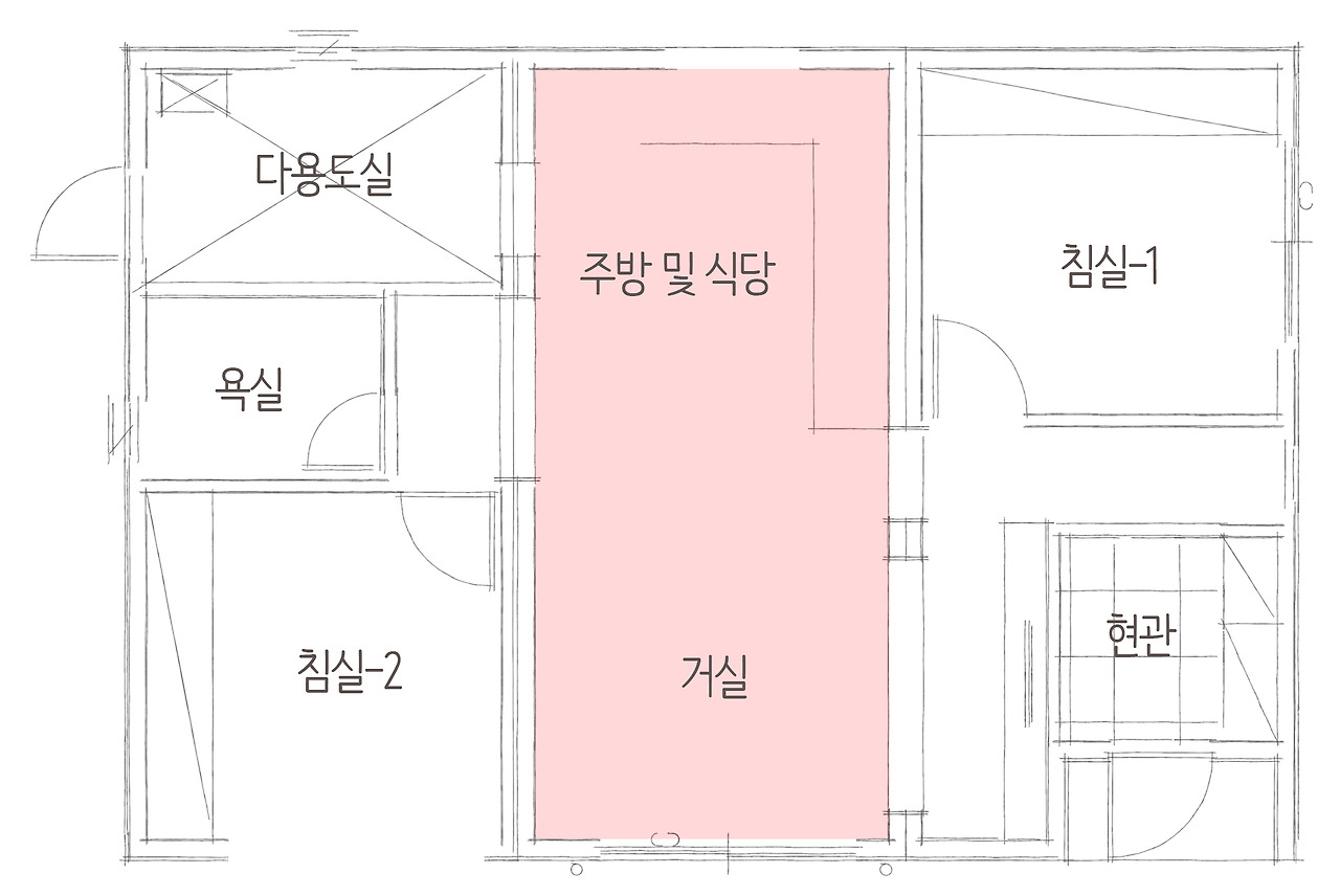 내부를 들어오면 현관으로 지나 침실-1을 거치면 거실과 주방이 일직선으로 함께 있는 것을 알 수 있습니다. 23평의 평수이므로 평수가 크지 않은 주택이기 때문에 적절히 필요한 공간만을 구성하여, 방 두 개, 욕실 하나, 다용도실로 실속 있는 구성을 갖춘 예쁜단독주택입니다.