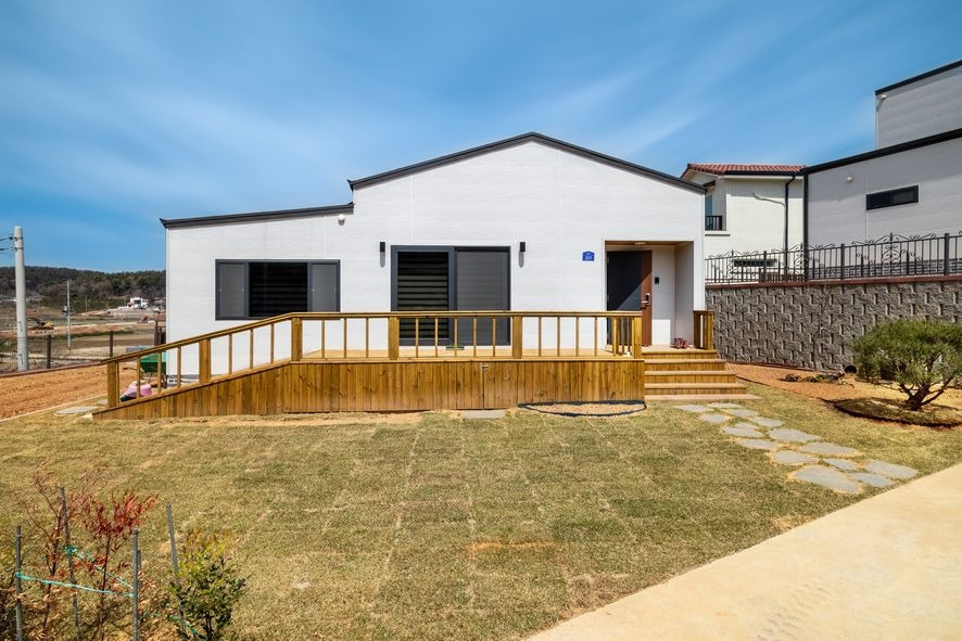 단층 예쁜단독주택의 장점은 공간의 로스율이 적다는 점입니다. 2층 전원주택을 계획하실 때에는 계단도 평수에 포함되기 때문입니다. 깔끔한 화이트한 외관에 박공지붕으로 포인트를 얹고 따스한 데크로 주택의 안정성을 더한 예쁜단독주택입니다. 단층 예쁜단독주택은 어르신을 모시고 계신 분들께 추천드리는 주택이기도 합니다. 관리도 수월하며 공간을 모두 활용할 수 있고 건축비까지 절감이 가능한 장점 가득한 주택입니다.