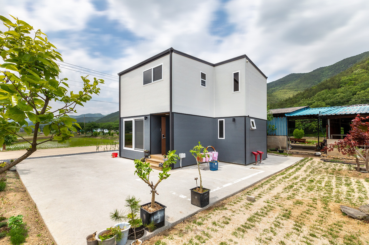 전원주택 단지 속에서 튀지 않고 조용히 고즈넉하게 자리 잡은 이번 전원주택시공 사례는 1층은 차분한 그레이 색상을 통하여 안정감 있는 디자인을 주었으며 2층 외관은 깔끔한 화이트톤으로 포인트를 주었습니다. 더불어 모듈의 모형을 독특하게 배치함으로써 주택을 질리지 않는 리듬감을 부여하였습니다. 집 안에서도 자연을 충분히 느낄 수 있도록 집 앞 마당과 동선이 어우러지며 거실에 있는 큰 페티오 창을 통해 바라보는 환경은 인생의 제2 막을 아름답게 시작하게 해줍니다.