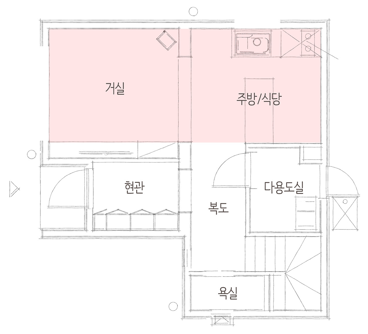 1층 공간은 13평으로 거실, 주방, 다용도실, 욕실이 있는데요, 주방과 거실은 오픈형 구조로 연결되어 좁은 평수의 집도 답답하지 않고 넓어 보일 수 있도록 시공하였으며 전체적으로 화이트톤 벽지와 밝은 색상의 바닥 마감재를 선택하여 주택 내부를 화사하게 비추었습니다.