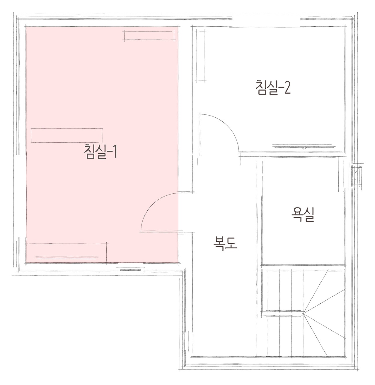 1층을 올라오실 때에는 계단 공간을 이용하여 협소 화장실을 계획하였는데요, 이렇게 센스 있는 설계는 공간의 로스율은 줄이고 모든 공간을 활용하여 평수에 비해 넓은 시각화의 장점을 가지게 됩니다. 침실 두 곳 중 큰 침실은 건축주님 부부의 침실 공간으로 숙면을 위해 불필요한 미적 요소는 생략하고 깔끔한 붙박이장을 통하여 넉넉한 수납공간을 주어 공간의 활용도를 높였습니다.