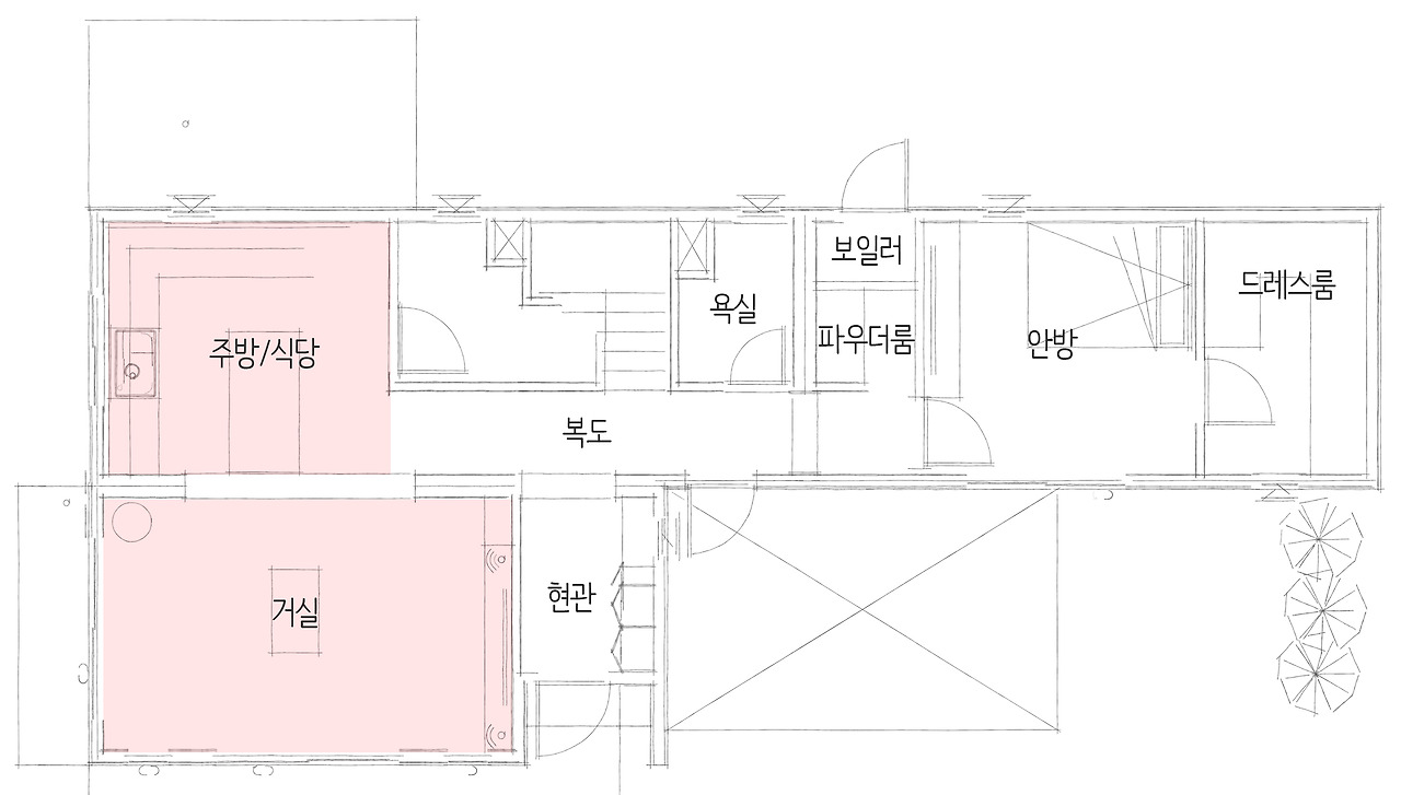 예쁜전원주택의 1층 모듈을 직사각형 구조로 설계되었습니다. 현관을 들어서면 거실과 주방/식당이 오픈형 구조로 트여져있어 개방감과 거실에 있는 큰 창을 통해 풍부한 자연 경관을 그림처럼 담아내었습니다. 계절의 변화하는 모습을 거실에서 바로 느낄 수 있도록 했으며, 복도를 지나면 프라이빗하게 안방과 드레스룸이 가장 안쪽에 있어 부부의 프라이버시를 지킬 수 있습니다.