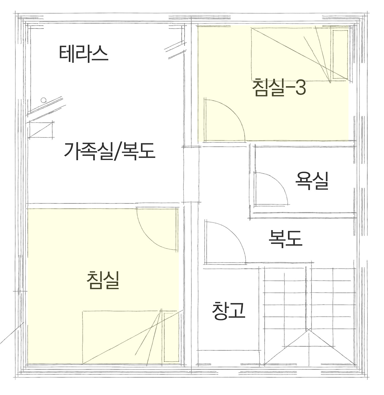 1층이 가족 모두의 공용 공간이었다면 2층은 개인 공간이자 프라이버시를 존중할 수 있는 공간이기도 합니다. 각 방은 전면 창을 두어 외부 풍경을 실내로 끌어당겨 액자와 같이 예쁜 풍경을 담아내었습니다.