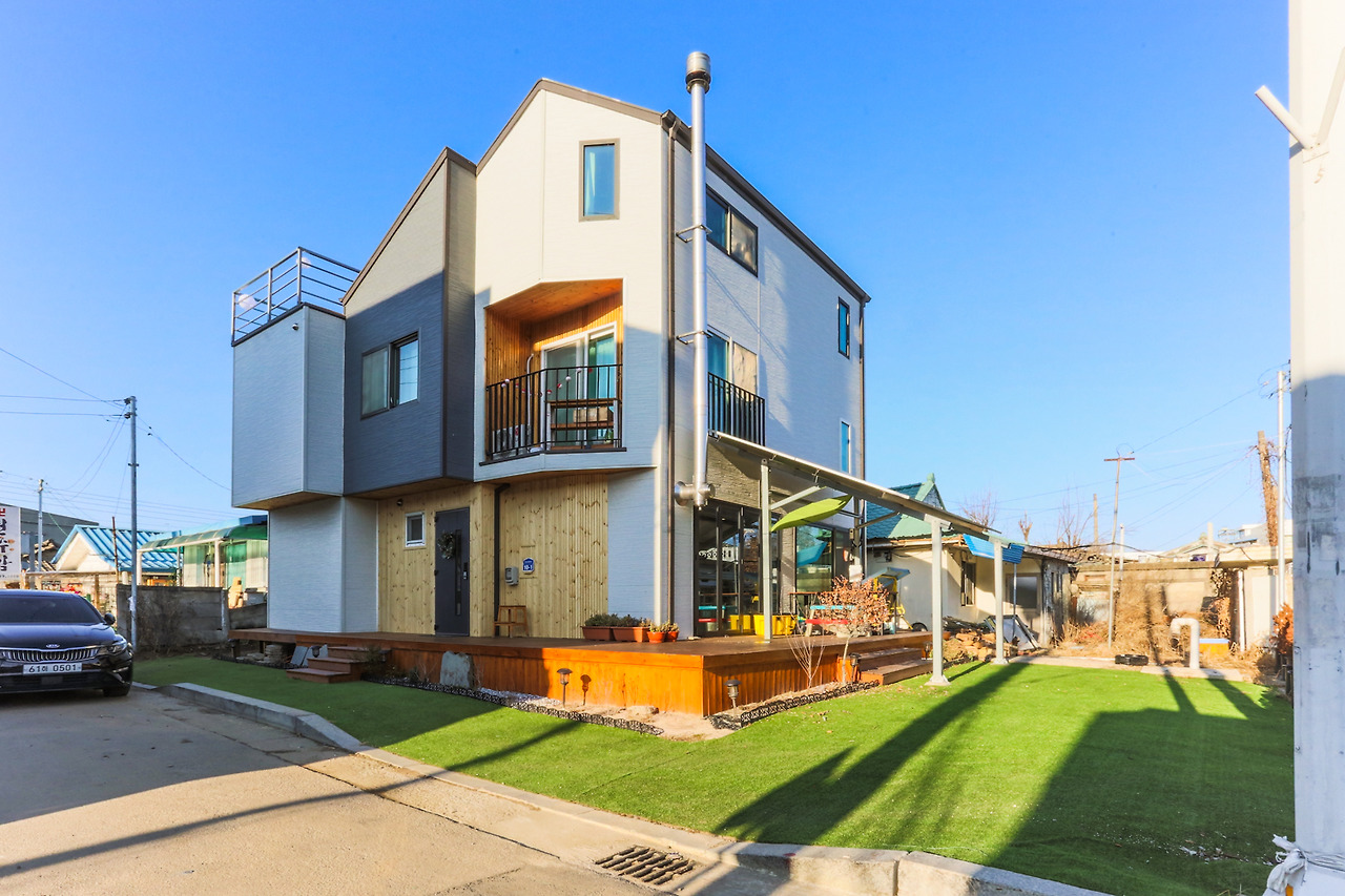 오래된 주택가 초입에 자리 잡은 전원주택의 푸른 마당은 골목 전체에 활기를 주는 것 같습니다. 건물의 상단을 돌출되게 시공하여 전체적으로 입체감을 부여하였고 외장재로 에코월 판넬을 사용하였습니다. 에코월 판넬은 갈바륨 철판 판넬의 내부에 발포 단열재를 넣어 샌드위치 판넬로 생산됩니다. 그래서 단열성이 아주 뛰어난 외장재인데요. 이를 사용함으로써 건축주님이 바라던 따뜻하고 편한 집에 한걸음 더 다가갈 수 있었습니다. 해당 전원주택은 지상 2층에 다락까지 설계되어 주변 주택들에 비해 높은 편으로 멋진 전망을 즐길 수 있습니다. 또한, 건물과 마당을 구분 짓는 높은 데크를 설치하여 마당과는 또 다른 전원생활의 낭만을 느낄 수 있도록 하였습니다. 데크에 앉아 마당에서 뛰어노는 아이들의 모습을 보면 절로 미소가 지어질 것 같습니다.