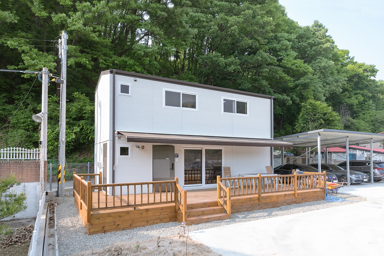공간제작소에서 현재 진행하는 최소 평 수인 18평으로 시공된 이 주택은 매일 생활을 하는 주거용 공간이 아닌 주말용 주택이기 때문에, 평 수도 합리적으로 선택하였으며, 위 주택은 한 층 당 층고가 높아 좁은 평 수지만 트여 보이는 개방감을 주었고, 단열과 방수에 우수한 써모사이딩판넬로 시공되었습니다. 전체로 모던하면서 깔끔한 색인 화이트톤과 박공지붕으로 포인트를 주었습니다.