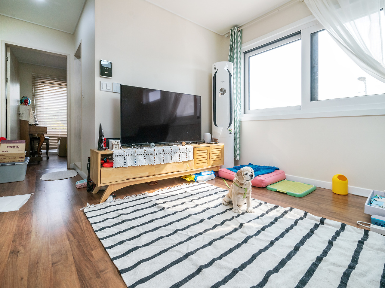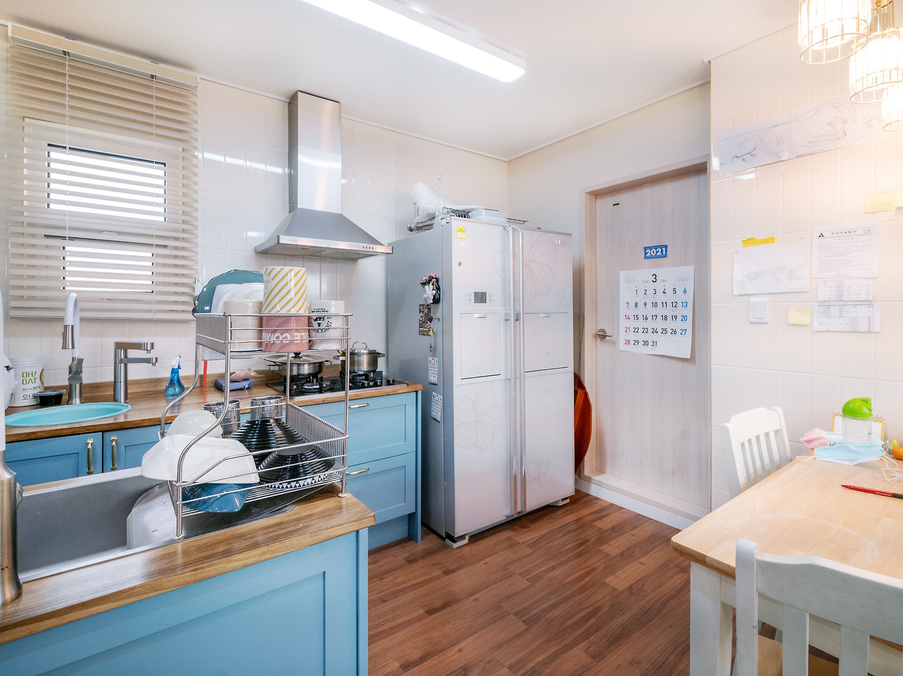 현관과 내부 사이에 중문으로 소음을 한번 더 차단하고 블루 컬러의 시원함과 패턴이 들어간 소품으로 포인트를 주어 생동감 있는 실내를 연출하였습니다.