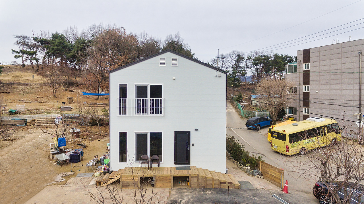 오늘 소개드리는 사례는 두 세대가 함께 사는 2층전원주택입니다. 외관은 화이트 메탈사이딩 외벽과 징크 지붕으로 완성해 깔끔하면서도 감성이 느껴지는데요. 안정적인 형태감으로 거주하실 가족분들이 행복하게 생활하실 수 있도록 기획했습니다.