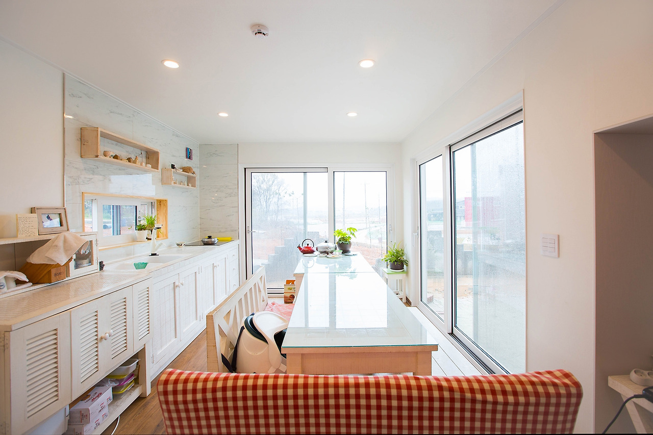 주방도 벽면을 크게 차지하는 창이 있어 건축주님의 자연 친화적인 성향이 느껴집니다. 좌 사진과 같이 넓은 창을 두게 되면 사진처럼 별도의 많은 조명이 없어도 자연 채광만으로 화사한 주방이 완성됩니다. 특히나 이 주방은 환기 걱정 없겠죠?