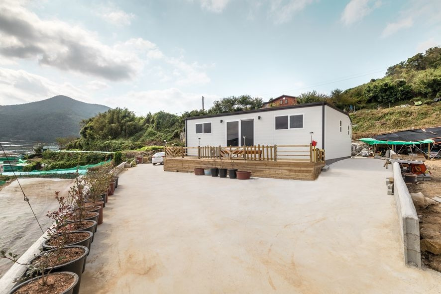 어떤 환경에서든 자연스럽게 어우러질 수 있는 편안한 느낌의 미니멀한 프리패브 목조주택입니다. 깔끔한 화이트톤으로 유행을 타지 않으며 질리지 않는 외관과 방수에 뛰어난 롤슁글을 지붕재로 마감하고 방수와 단열이 우수한 메탈사이딩과 목재사이딩을 결합하여 외장재를 마감함에 따라 지역인 전라남도 여수의 특징, 바닷바람에도 강한 주택을 완성시켰습니다. 어느 것 하나 해치지 않고 편안하게 자리 잡은 이 주택은 최소 평 수 18평으로 계획되어 가격적인 면까지 합리적인 프리패브 목조주택입니다.