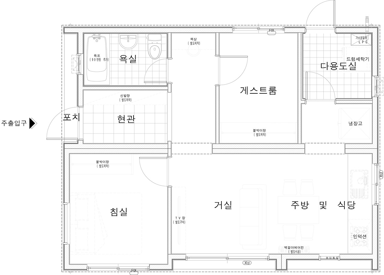 주방은 18평 형 소형 전원주택이기 때문에 동선을 최소화한 일자 주방 형태로 시공하였고, 상부장과 하부장은 화이트톤으로 깔끔하고 모던한 주방을 시공하였습니다.