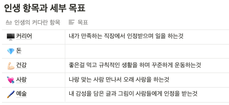 덧붙여서, 목표 문장을 적기까지는 시간이 꽤 걸렸다. 예를 들어 커리어 항목에서의 목표 문장은