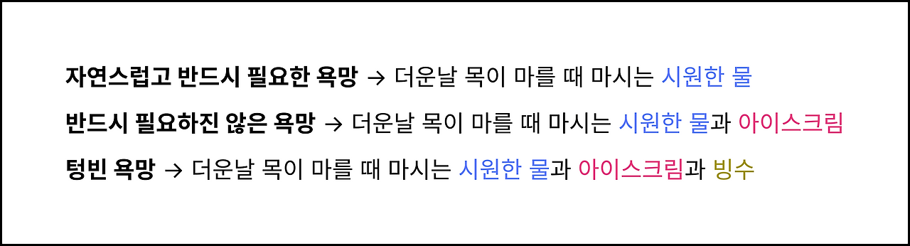 시원한 물은 그 상태를 벗어나기에 충분한 재료가 된다. 하지만 순간적으로 더 쾌락적이기 위해서 아이스크림과 빙수를 먹는다면 우리가 바라게 되는 건 덥고 목마른 상태를 벗어나는 게 아닌 더 시원한, 더 상쾌한 상태를 바라게 될 것이다. 아이스크림과 빙수를 먹은 사람이 나중에 더울 때 시원한 물로 충분히 만족할 수 있을까? 나중에는 쾌락을 위해 화채를 바랄지도 모른다.