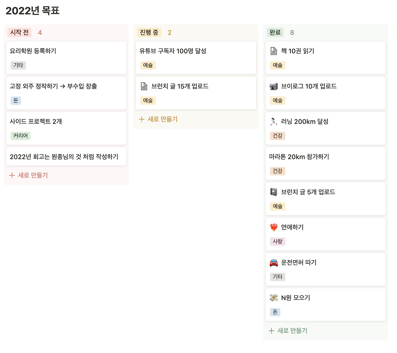 요리를 하고 싶었으나, 학원이 불필요하다고 생각이 되어서 다니지 않았다. 하지만 이 목표는 목표 설정부터 잘못된 것 같다. 요리학원 등록이 아니라, '할 줄 아는 요리 N개수 채우기'로 하던가, '가족 or 친구에게 요리 대접해 보기'로 했어야 의미가 있었지 않았을까 싶다.
