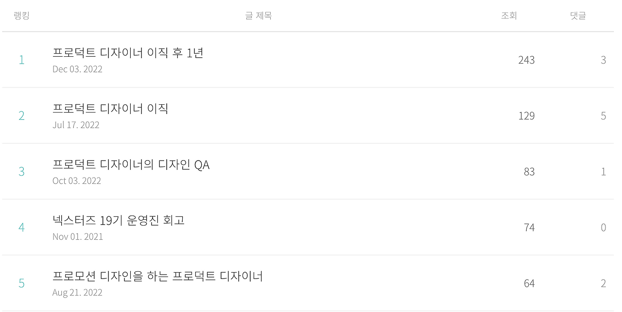 이번 년도에 브런치글 11개를 발행했다. (2021년 회고글은 제외하고) 5개가 내 목표였는데 그 두 배를 발행하다니, 대단하다! 주목하고 싶은 점은 서평, 여행기, 달리기 글을 제외하고 디자인 본업과 관련된 글을 발행했다는 점이다. 사실 내가 5년 차 디자이너이긴 하지만, 디자인 관련해서 내가 어떤 효용을 줄 수 있을까? 고민이 많이 됐었다. 하지만 어떻게든 쓸 수 있을 거라고 생각했고, 첫 글로 프로덕트 디자이너 이직 글을 썼다. 생각보다 많은 분들이 글을 좋아해 주시고, 구독도 해주셔서 굉장히 뿌듯했다. 다음은 12월 한 달간의 조회수 랭킹이다. 1위의 글은 12월에 업로드를 했기 때문에 조회수가 상대적으로 많지만, 그 아래의 것들은 꾸준하게 유입이 되는 글이다. 내년에는 조금 더 나은 글감을 많이 생각하길 바란다.