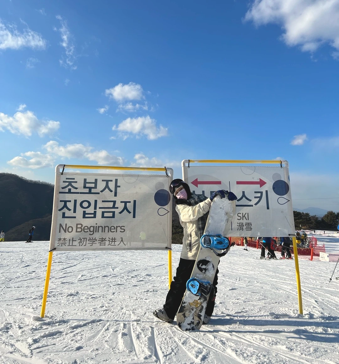 하지만 무서웠던 상황은 내가 내려와서 가만히 서 있을 때 어느 이름 모를 보드가 휙 미끄러져 내 다리 사이를 지나쳐갔다는 사실이다. 내년도 보드를 타러 가는데, 부디 다치지 않길!