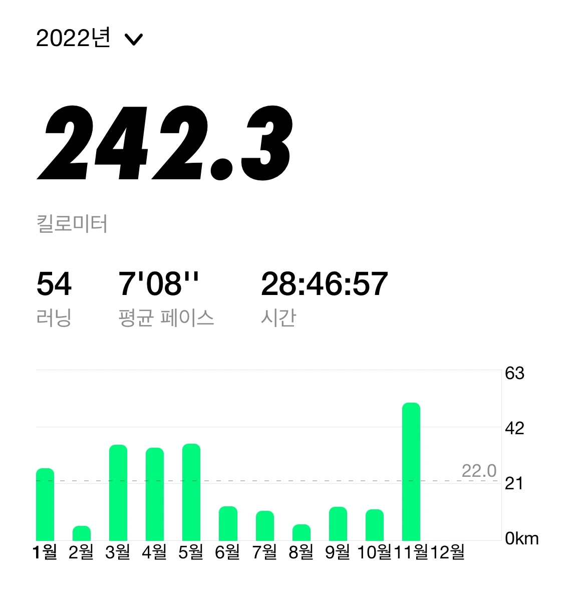 러닝 횟수를 70회 정도로 늘리고, 300km 이상을 달리고, 평균 페이스도 줄여보자. 2022년보다 나은 성적을 위해서!