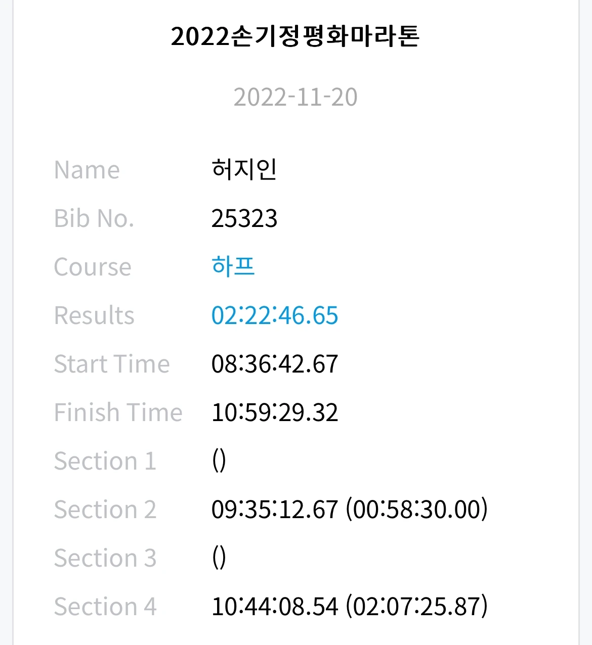 약 21km의 거리 중에서 마지막 1km가 기억에 남는다. 1km를 남겨두고 레일 밖으로 마라톤 관계자들, 친구를 응원하러 온 지인들이 쭉 서있었다. 나와 일면식이 없는 사람인데도 불구하고 달리는 나와 헌진이를 응원하고 있었다. 내가 뛰고 싶어서 뛰는 게 아니었다. 숨이 차는 걸 둘째치고 다리가 내 다리가 아닌 것 같았다. 다만 내가 뛸 수 있었던 건 옆에서 헌진이가 계속 응원해주고 레일에서 응원해주는 사람들 덕분이었다. 그 순간을 잊지 못할 것 같다. "할 수 있어!!"라며 외치는 순간을.