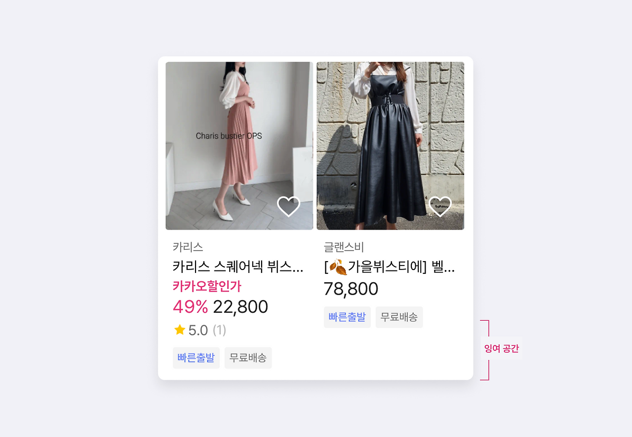 첫번째로는 잉여공간으로 더 많은 상품 카드를 사용자에게 보여줄 수 없다는 점이었는데요. 풀어말하자면 상품의 정보에 따라 요소가 추가되고 빠지며 모든 상품 카드가 동일한 높이값을 갖고 있지 않아서 생기는 문제였습니다. 만약에 상품 카드가 동일한 높이값을 가지고 간다면, 잉여공간이 생기지 않을 테고, 그 공간에는 약 1행의 상품카드가 들어갈 수 있을테죠.