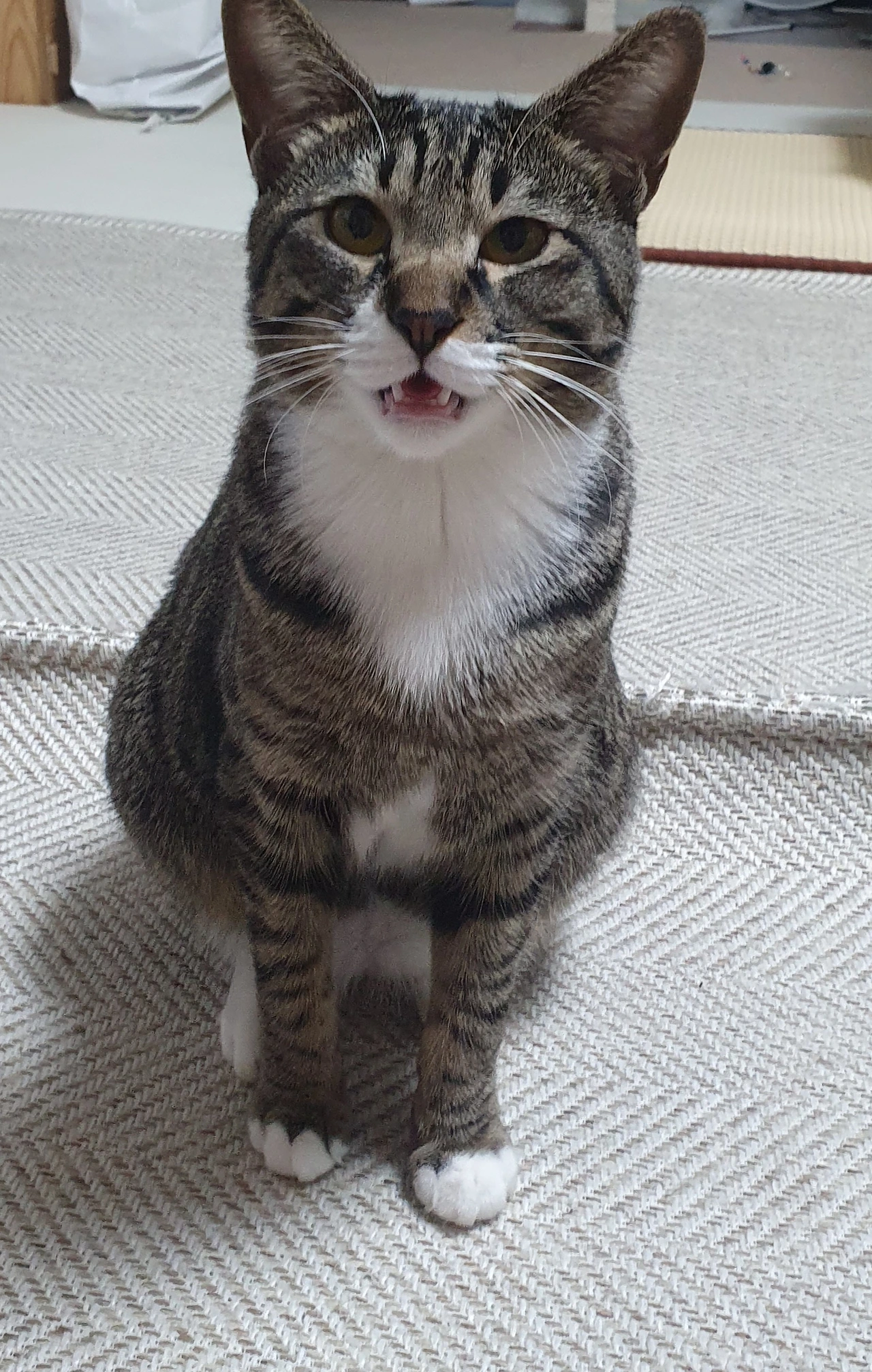 깨비는 혼자 있는 낮동안에는 거의 아무 말도 하지 않다가, 제가 퇴근하는 순간부터 폭풍 수다쟁이가 됩니다. 깨비 물그릇과 밥그릇들을 설거지하고, 바닥에 흩뿌려놓은 모래들을 청소하는 동안에도 내내 제 뒤를 졸졸 따라다니며 쉴 새 없이 왜옹왜옹 말을 하는 거죠. 그러면 저도 중간중간 '어이구 그랬어?'라든가 '이야 우리 깨비가 그랬구나~' 같은 추임새를 넣어 줘요. 그러다 제가 화장실이라도 가면 화장실문 앞에서 집이 떠나가라 고래고래 소리치기 시작합니다. 그렇기 때문에 화장실은 가급적 참았다가, 깨비의 수다가 완전히 끝나고 가는 편이 좋습니다. "깨비야 그렇게 소리 지르면 엄마 층간소음 때문에 쫓겨나..." 말해보았지만, 물론 설득된 적은 단 한 번도 없습니다.