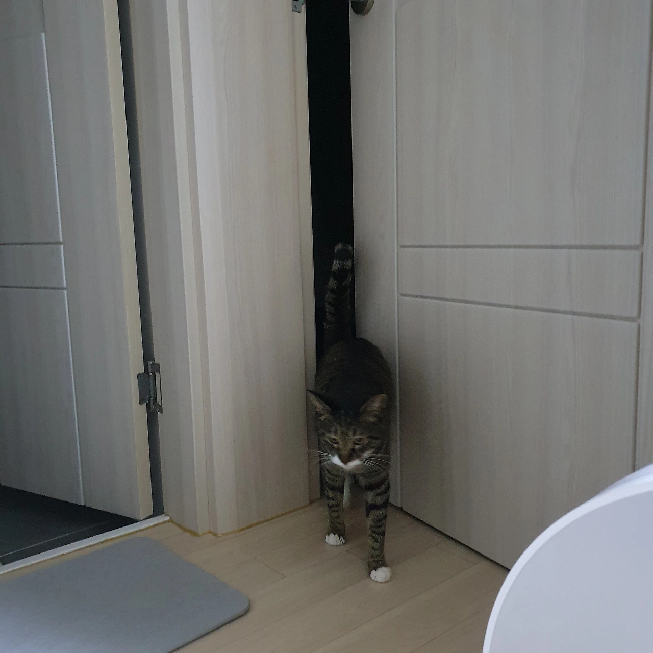 앞발로 이렇게 저렇게 문틈을 넓히고는 따라 나오는 깨비입니다.