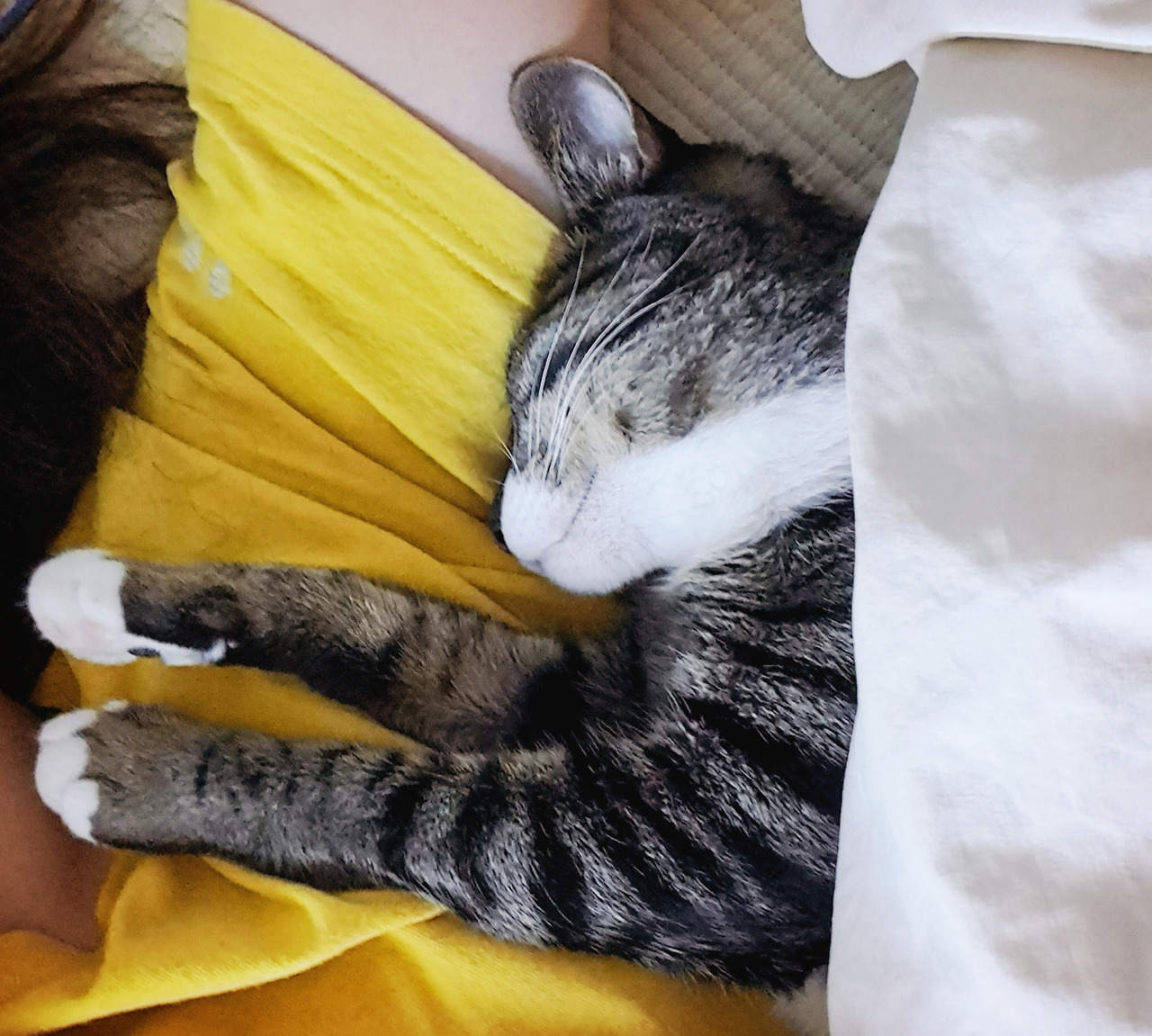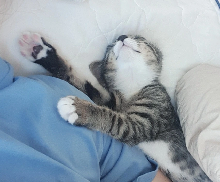 집에 온 지 딱 삼일째 되던 날부터 깨비는 우는 것을 멈추고 원래부터 이 집 고양이였던 양 자연스럽게 주인행세를 하기 시작했습니다. 1킬로그램이 조금 넘는 몸으로 집안 구석구석 킁킁거리며 순찰을 돌고, 밥도 와구와구 잘 먹고 화장실도 잘 갔어요. 그리고 밤엔 안 그러면서 집사가 낮잠을 잘 때면 꼭 옆을 파고들어 팔베개를 하고 같이 자곤 했습니다. 곧 한 살이 되는 지금까지도 낮잠시간엔 집사의 팔베개가 필수인가 봐요.
