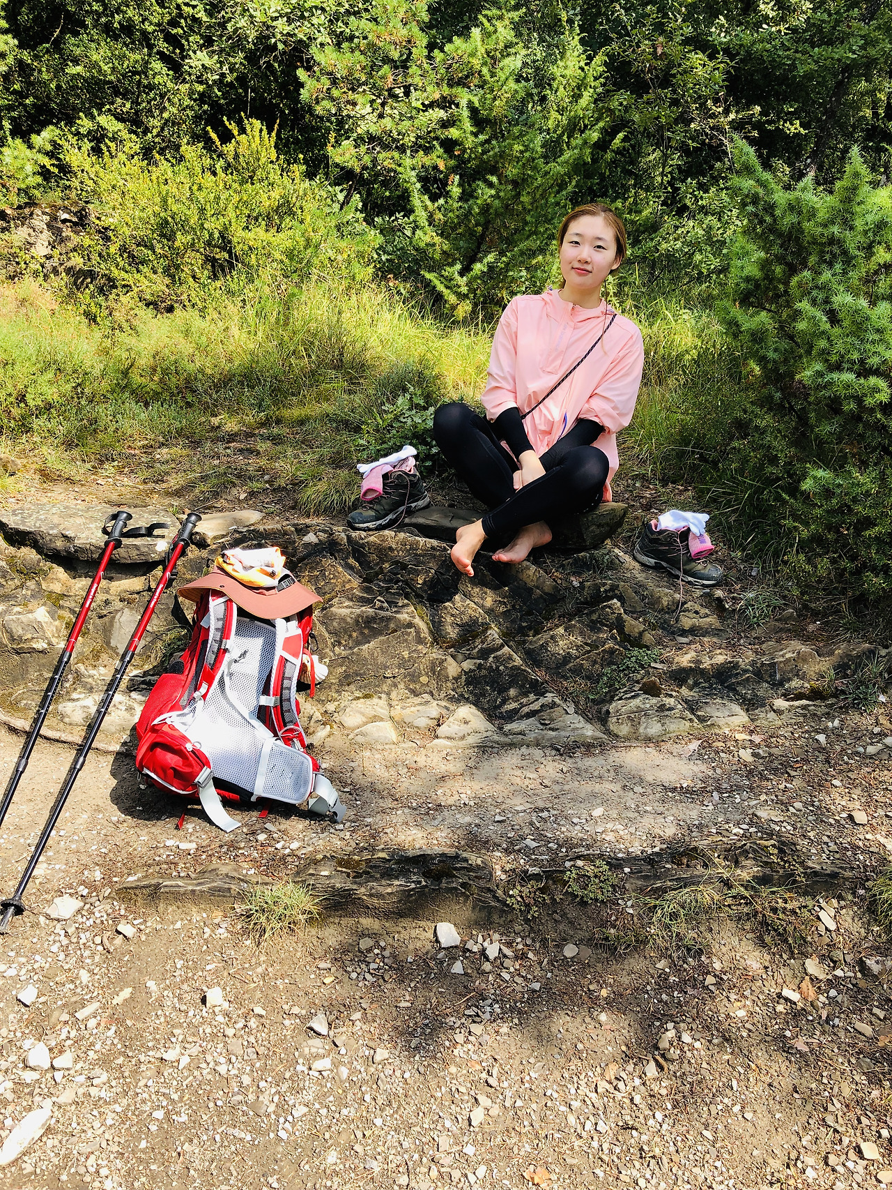 그러고 또 한참을 걷는다. 한참이라는 것은 목적지인 다음 숙소에 도착할 때까지의 시간을 뜻한다. 걷다가 중간중간에 적당한 장소(벤치, 넓은 돌, 푸드 트럭, 그늘 등)가 나오면 쉬어준다. 쉴 때는 모자도 벗고 등산화도 벗어서발을 바람에 말리며 해방감을 누린다. 날마다 걷는 거리와 걸리는 시간이 다른데, 평균 27km를 7~8시간에 걸쳐서 간다. (처음엔 천천히 조금씩 걷다가 체력이 붙으면 빠르게 많이 걸을 수 있다) 걸을 때 만나는 무화과 향기, 길냥이, 들꽃, 기분 좋은 시원한 바람이 나를 행복하게 만들어준다. 특히 중간에 목이 마르면 꼭 환타오렌지(맛이 나는 KAS라는 음료수. 그냥 편하게 환타오렌지라고 불렀다. 맛이 완벽히 똑같다)를 사서 마셨는데, 그 목넘김이 얼마나 청량한지 온몸의 세포가 좋다고 비명을 지르는 것 같았다.