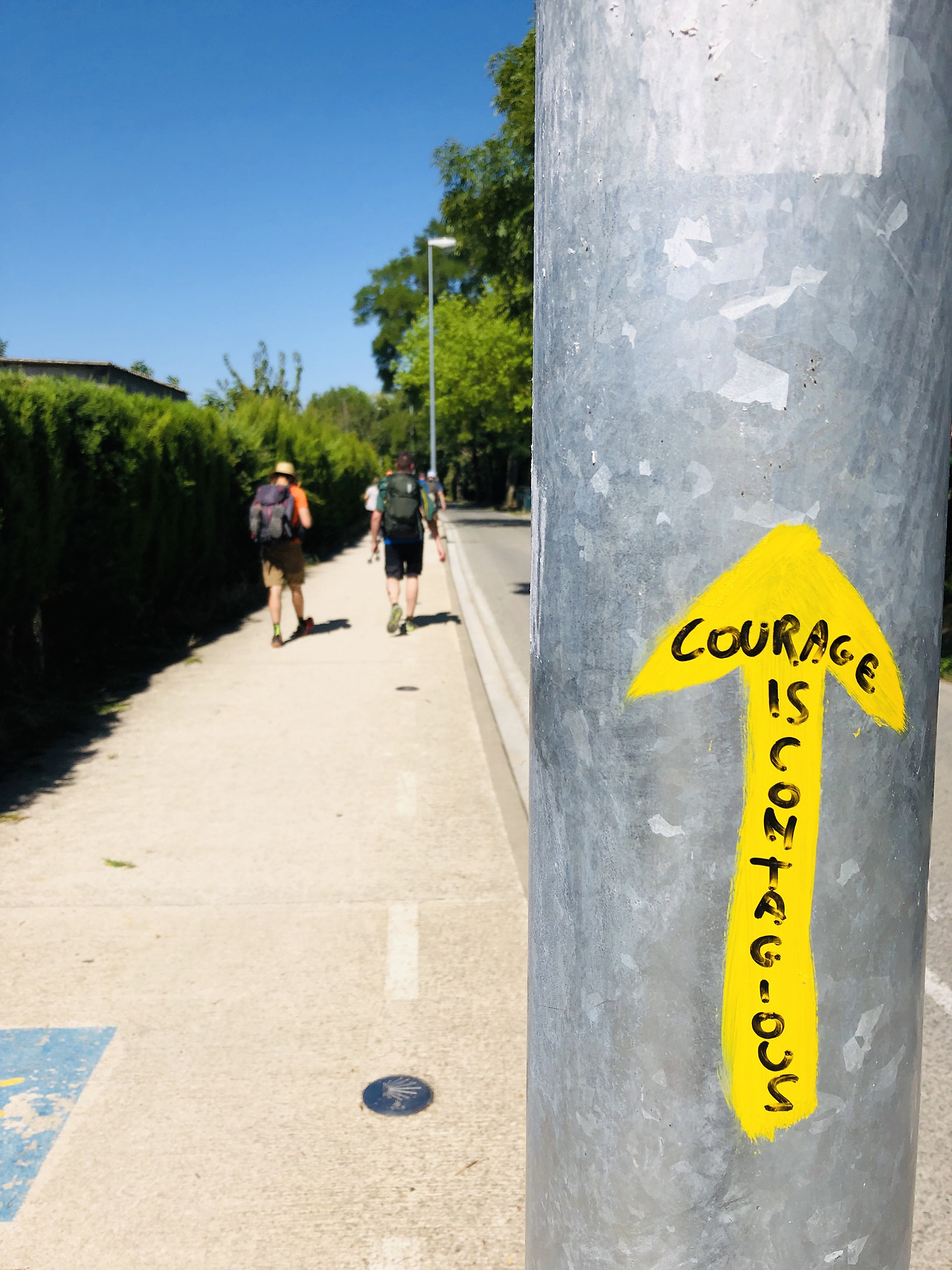 이탈리아 무리의 씩씩함에 자극을 받아서 나는 더 열심히 걸었다. 나 또한 씩씩해 보이고 싶었다. 마주쳤을 때 고통에 힘겨워하며 빌빌거리는 연약한 모습이 아니라, 두려워하는 게 많은 쫄보의 모습이 아니라, 용감하고 당당하게 한발 한발을 옮기면서 이 길을 즐기는 그런 모습으로 기억되고 싶었다. 생생하고 자신감이 넘치며, 이 길을 정복해나가고 있는 반짝이는 눈빛으로. 건강하고 나만의 페이스에 맞게 힘차게 걷는 근사한 이미지로. 그렇게 걷기 위해 노력했다. 나는 순례길에서 내 모습이 무척 마음에 들었다. 내가 원하는 나의 모습으로 그 길을 씩씩하게 걸었다. 씩씩이 이탈리아 무리들도 나를 젊음 그 자체의 씩씩한 사람이라고 기억하기를. 용기는 그렇게 전염되었다.