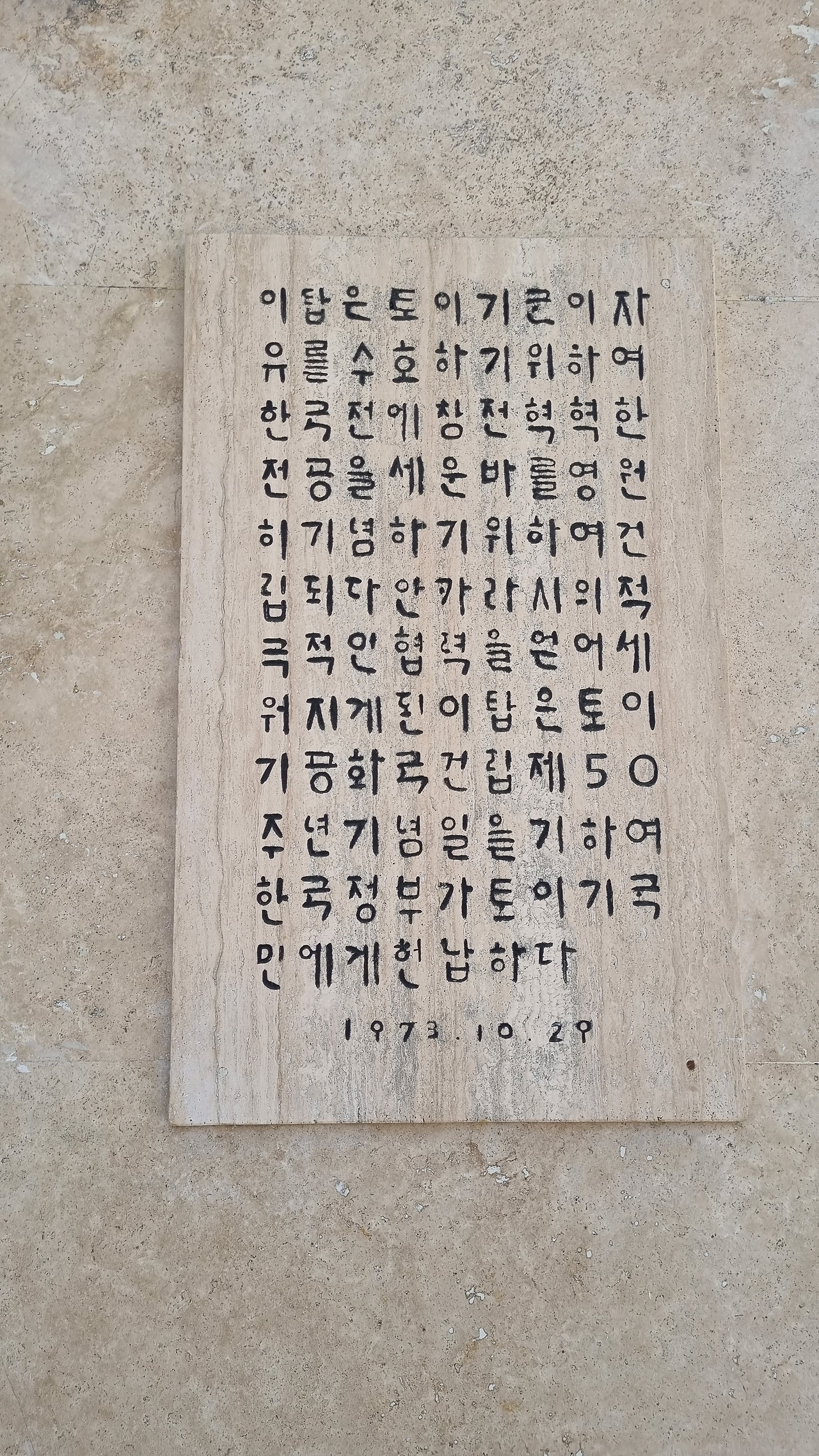한국전쟁 참전기념 한국공원을 방문하여 6.25 당시 유엔군의 일원으로 참전하여 희생한 터키군인들을 기리기 위한 기념탑에서 우리 일행은 묵념을 하고 그들을 기렸다.