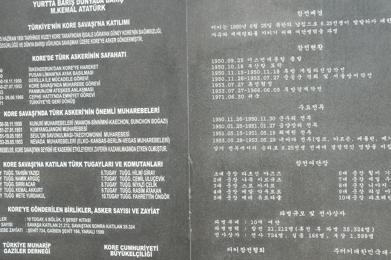 1950년 9월 처음 참전해 육군 총 2만 1212명을 파병했으며 수많은 사망자(966명)와 부상자(1155명)를 냈다. 사상자의 명단이 비석에 새겨져 있다.