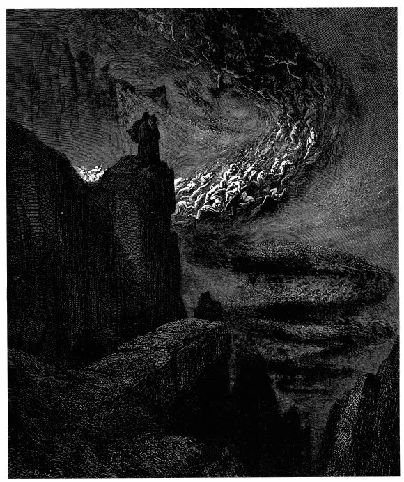 2 옥은 색욕에 빠져 자신과 주변 사람들을 파멸로 몰아 놓은 자들이 가는 곳으로 시도 때도 없이 폭풍에 휩쓸리는 광경이고