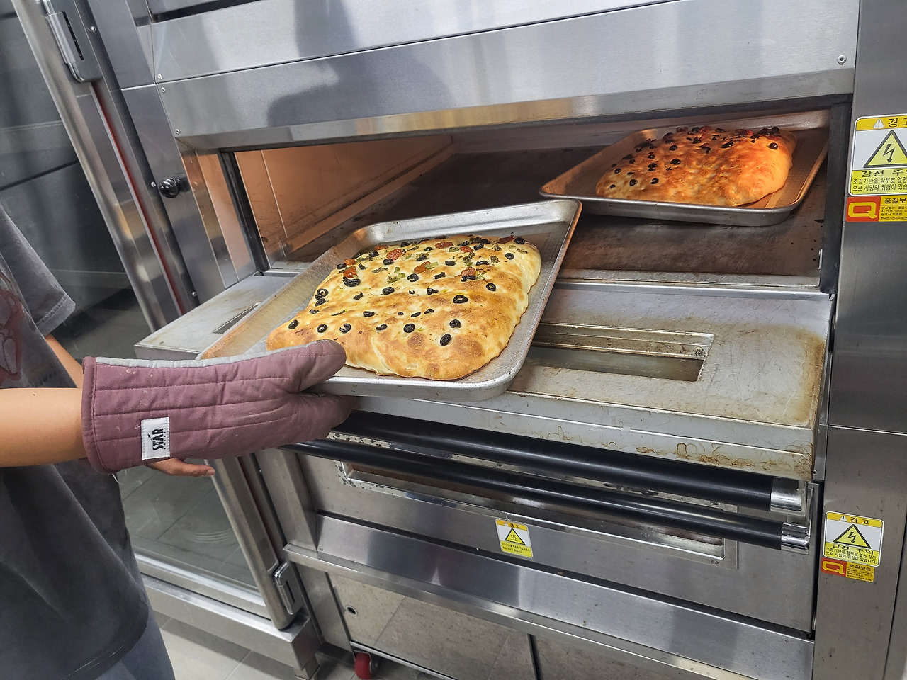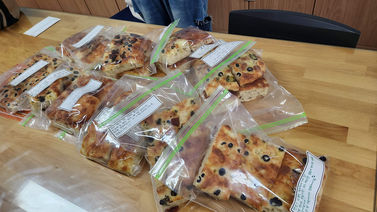 마지막 발효가 끝나고 오븐에 각자 정성스럽게 만든 포카치아 반죽을 넣었습니다. 이현이 집에서 가져온 말린 토마토와 바질 페스토가 더해져 더 풍성한 빵을 만들 수 있었습니다. 발효 시간은 길었지만 오븐에 굽는 시간은 15분 내외로 금방 끝났습니다. 고소하고 맛있는 냄새가 퍼졌습니다. 키가 큰 다람이 3층짜리 데크 오븐을 능숙하게 사용하는 모습이 멋있었습니다. 집에서 자주 빵을 구워봤지만 누군가에게 알려주면서 단원 한 사람 한 사람 반죽을 살펴봐준 다람이 참 고마웠습니다.