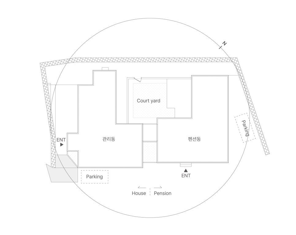 스테이 ‘산월(山月)’는 대나무숲이 우거진 동쪽을 바라보는 땅이었습니다. 동향의 여건상 채광을 확보하기 어려운 단점을 고민을 하던 중, 일반적인 형태인 가로로 기다랗게 배치하는 형태 대신 최대한 채광을 끌어오기 위해 땅을 쪼개는 방법을 선택했습니다. 이렇게 ‘관리동’과 ‘시설동’ 두 개의 동을 각각 배치하여, 두 곳 모두 남쪽의 안마당을 확보할 수 있었습니다. 햇빛이 넓게 드리운 안마당을 최대한 활용하기 위해, 남쪽에 커다란 창을 내고 채광을 집안으로 끌어들여 프라이빗 한 안마당과 남향의 채광을 동시에 확보해 스테이 ‘산월(山月)’만을 위한 휴식이 담긴 고유한 프라이빗 공간이 완성되었습니다.