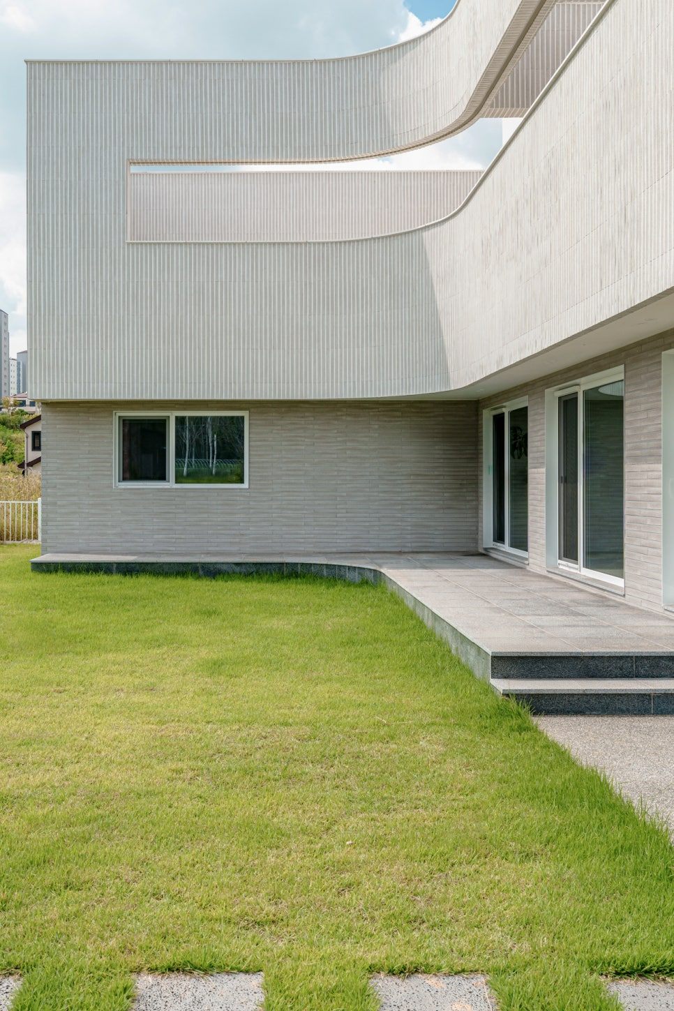 콘체르토(CONCERTO)의 외관은 매스의 무덤덤한 직선이 이루는 표정과는 대조적으로, 안마당으로 펼쳐진 유려한 곡선으로 안정감 있게 자연을 품고 있습니다. 쭉 뻗은 직선의 틈에서 피어난 이곳의 마당은 마치 그랜드 피아노를 닮은 웅장한 외관과 함께, 외부와 내부를 조화롭게 연결합니다. 직선과 곡선의 서로다른 교차를 통한 대비가 예상치 못한 자연의 아름다움을 발견하게 해 주며, 입구로 들어가는 순간부터 싱그러운 기대감을 갖게 합니다.