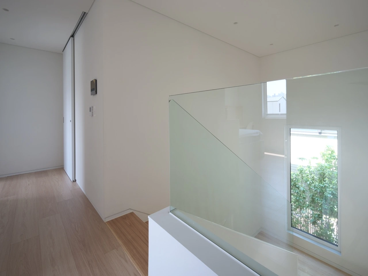 투명한 유리 핸드레일은 위에서 아래를 내려다보는 시선까지 열어줍니다. 시야를 가리지 않는 덕분에 2층과 1층의 흐름이 산뜻하게 이어집니다.
