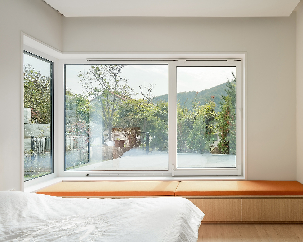 솔내음이 살며시 문턱을 넘나들고, 창밖으로 계절이 흘러가는 소리를 들을 수 있는 이곳은 초록의 건강한 에너지가 그대로 전해집니다. 장림재(長林齋)는 매 순간 자연과 교감할 수 있도록 설계 되었습니다. 집안의 모든 각도에서 울창한 자연을 담아낼 수 있도록, 각 공간마다 큰 창문을 배치하여 곳곳에 생동감을 부여하고, 변화하는 계절의 눈부신 아름다움을 이곳에 가득 옮겨놓았습니다. 특히 전면창의 거실은 마당까지로 시선이 자연스럽게 닿을 수 있어 안에 있지만 밖에 있는 듯한 착각이 들게 합니다. 전면창이 다소 부담스러울 수 있는 안방에는, 침대에 누웠을 때 꼭 알맞은 눈높이의 창문을 설치하고 양쪽 측면에 코너창을 추가하여, 파노라믹 한 숲속의 모습을 실내로 끌어들였습니다.