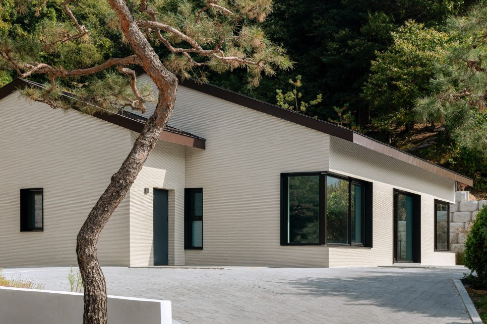 장림재(長林齋)는 자연이 만든 가장 이상적인 땅에 있습니다. 집의 뒤편에는 울창한 숲이, 남쪽에는 맑은 물이 흐르는 전형적인 배산임수(背山臨水) 자리입니다. 광활함 속 은은한 존재감이 돋보이는 이곳은 수직과 수평이 조화롭게 어우러진 미학의 공간으로, 장성한 나무 사이 고요히 빛나는 삶의 터전입니다. ‘수직의 선’이 돋보이는 우뚝 솟은 나무들 사이 마치 한옥을 떠올리게 하는 나직한 외관이 인상적입니다. ‘수평의 매스’가 돋보이는 이곳은 고층으로 설계할 수 있었으나, 건축주님의 노년 생활을 배려하고 숲과의 조화를 위해 1층 구조로 정직하게 설계되었습니다. 자칫 지루해 보이는 매스의 구조적 특징을 반영하여, 현관에 박공지붕을 추가로 설치해 입구에 상징성을 부여했습니다. 자연스럽게 이어진 처마는 비나 눈이 올 때 가림의 역할을 하여 실용성까지 고루 갖춘 형태로 완성되었습니다.