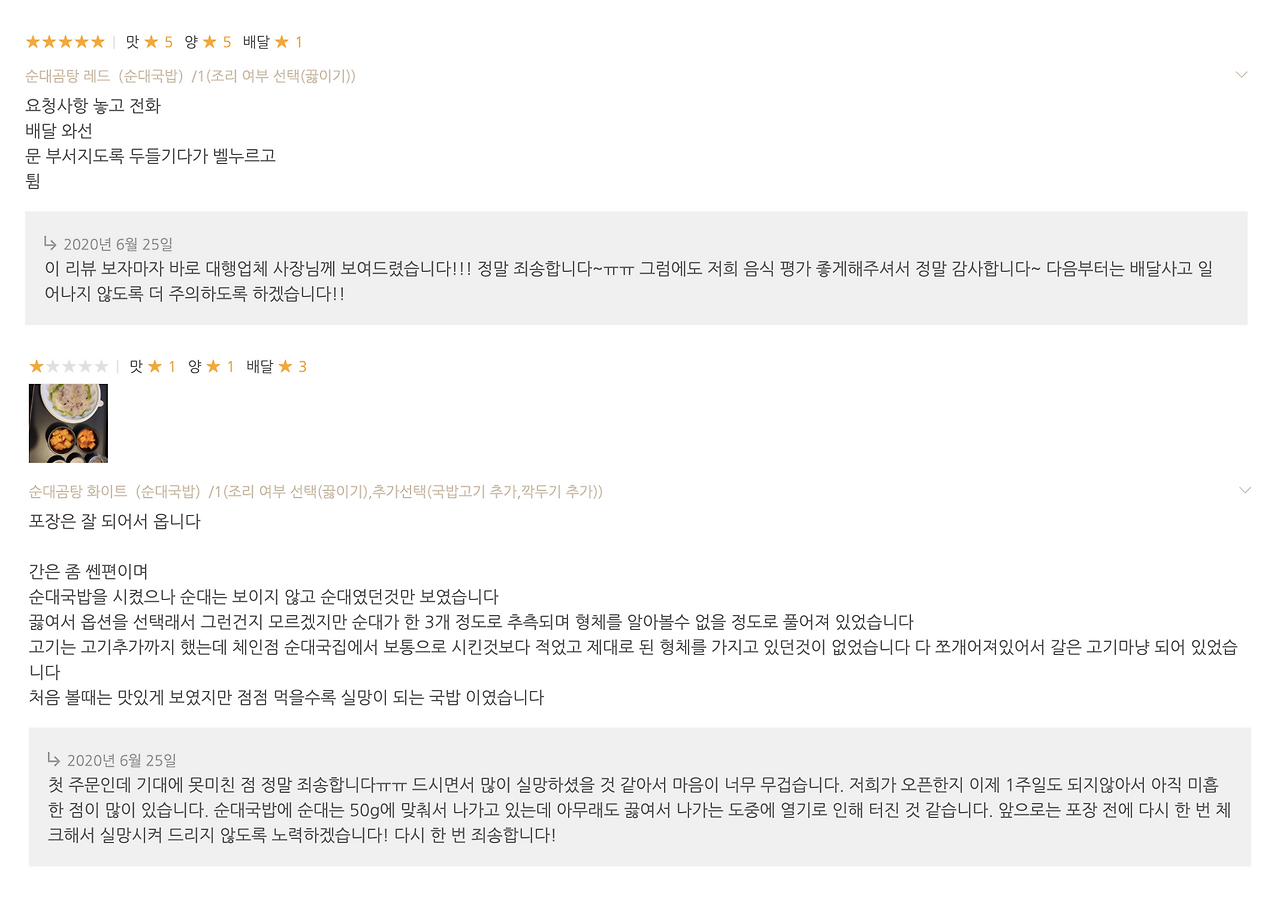 하루에 한 명은 꼭 나타난다. 1인분을 시켜놓고 요청사항에 2인분만큼 달라고 하는 사람들. 리뷰가 무서워서 대부분 더 담아주긴 하지만 간혹 실수로 덜 챙겨주는 일이 생기는 경우, 평점 1점 테러는 각오해야 한다. 이 날이 그랬다. 이모님께서 서비스로 나가는 소면을 기본 양만큼만 보낸 까닭에, 별 1개가 달렸고 졸지에 요청사항을 잘 들어주지 않은 가게가 되었다. 다른 것들은 기본보다 양을 추가해서 보냈는데도 말이다. 그럼에도 불구하고 답글에 시원하게 한 마디 못하고 고개 숙여야 하는 사장님은 속이 타들어 간다. 하지만 이제는 말할 수 있다.