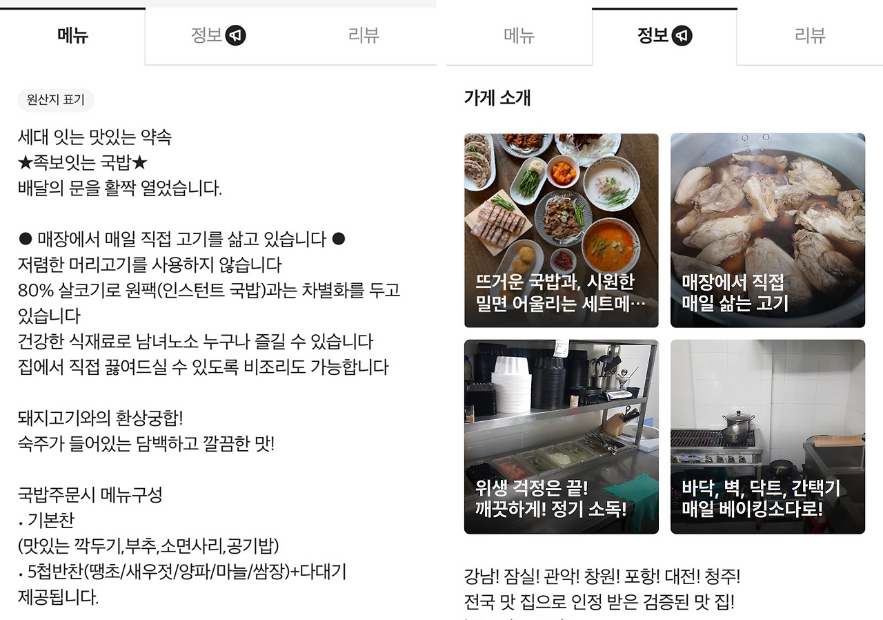 배달의 민족에서 우리 가게를 홍보할 수 있는 3가지의 지면이 있다. 메인 화면의 메뉴 탭에서 보이는 원산지 표기 부분과 정보란의 가게 소개, 마지막으로 리뷰탭에 사장님 공지가 있다. 이전에도 말했다시피 나는 가게의 위생이 가장 중요한 요소라고 생각했기 때문에 가게 소개란에는 위생과 관련된 콘텐츠를 집중적으로 게시했다. 매일 청소가 끝낸 가게의 모습을 업로드하면서 스스로도 뿌듯함을 느끼기도 했고, 이 느낌은 고대로 손님들에게도 전해지리라 믿었다.