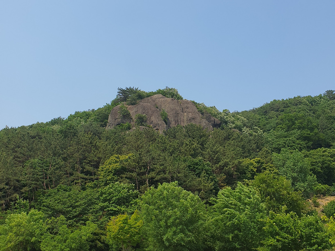 아래에서 보니 부엉이 바위가 소나무 몇 그루로 흉측한 제 몸을 가려 상반신만 드러내 보인다.