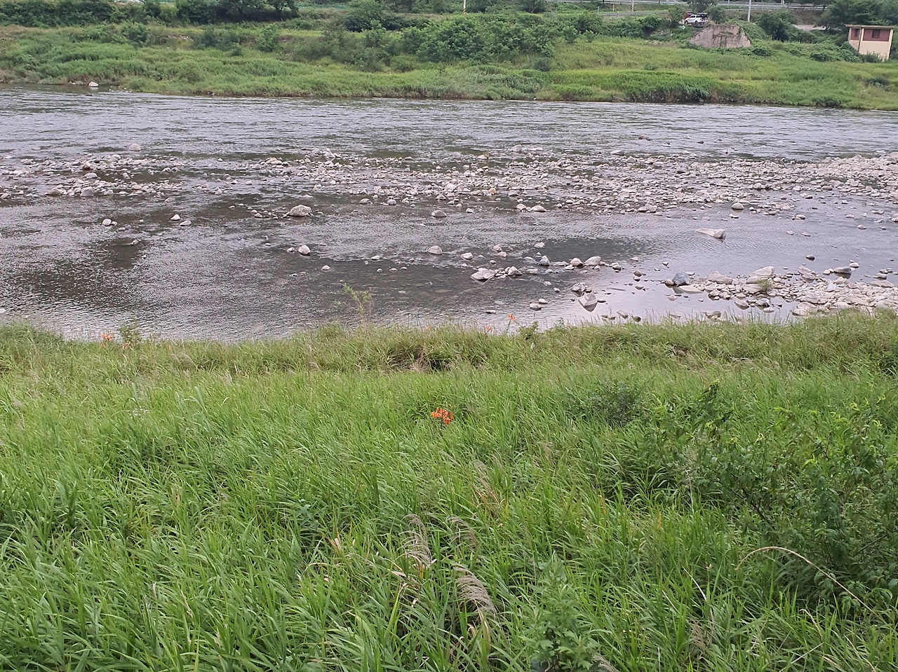강가엔 몇몇의 참나리가 진록의 갈대사이에서 붉게 흔들리고 있습니다.