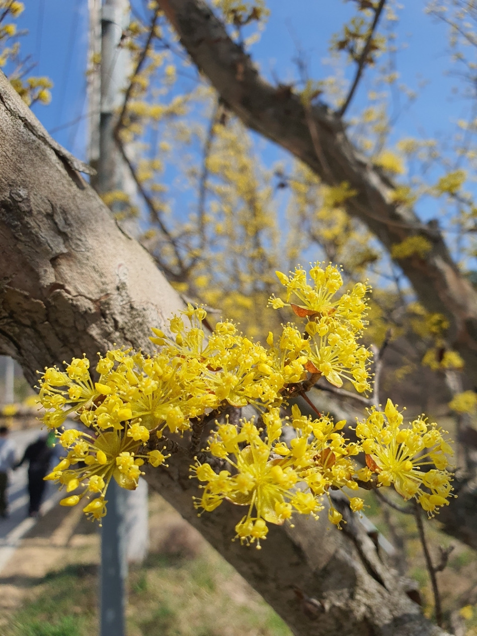 키 큰 산수유나무 아래를 거닐면 노란 꽃가지가 어깨를 스친다.