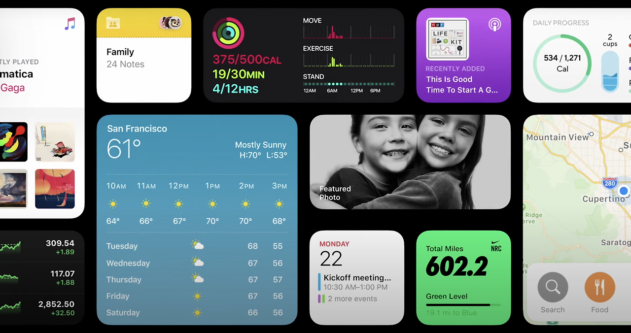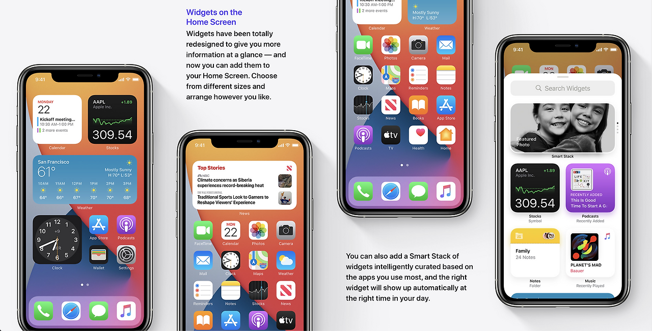 일단 가장 눈에 띄는 변화는 새로운 iOS 14의 맞춤형 위젯 기능입니다. 그동안 아이폰의 단점으로 꾸준히 지적되었던 바탕화면에 위젯을 활용한 커스텀 기능이었는데요. iOS14 홈스크린 앱 라이브러리를 통해 자주 사용하는 어플과 비슷한 성격의 어플을 카테고리 별로 묶을 수 있으며 홈 화면에서 사용자가 원하는 크기에 맞춰서 변경할 수 있도록 업데이트되었습니다.
