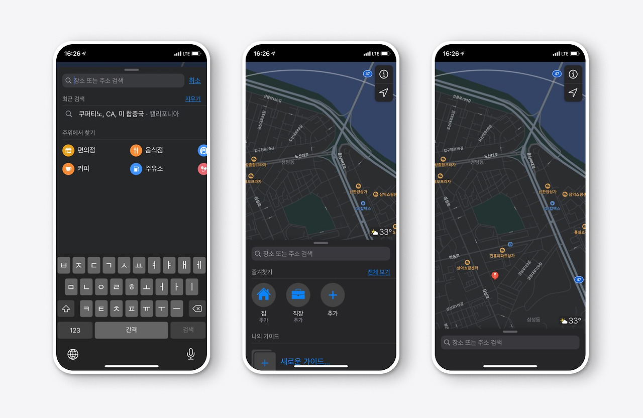 사용자가 지도를 실행하는 이유는 무엇일까요? 가장 큰 목적은 장소를 검색하는 이유가 가장 클 것으로 예상됩니다. 그러면 검색 서치 바가 가장 터치하기 편한 위치에 있으면 더욱 좋은데 이점은 애플 지도에서 확인할 수 있습니다.