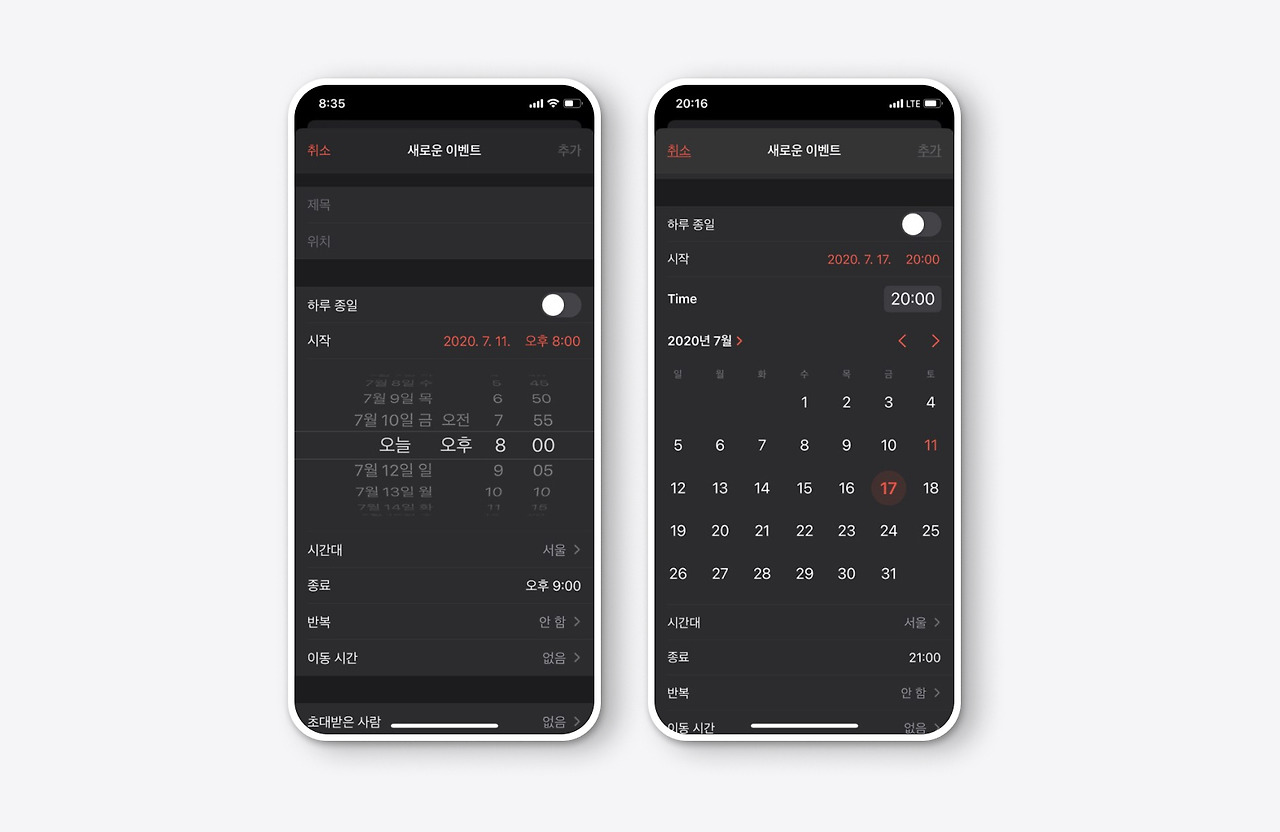 날짜 선택하는 UI는 굉장히 다양하게 사용되고 있습니다. 애플은 그동안 사용하던 카운트다운 형식의 날짜 선택 UI를 사용하였는데 이번 iOS14에서는 캘린더 형식의 날짜 선택 UI를 선택하였습니다. 시간과 날짜를 더 빠르게 입력할 수 있는 스타일로 변화되었습니다.