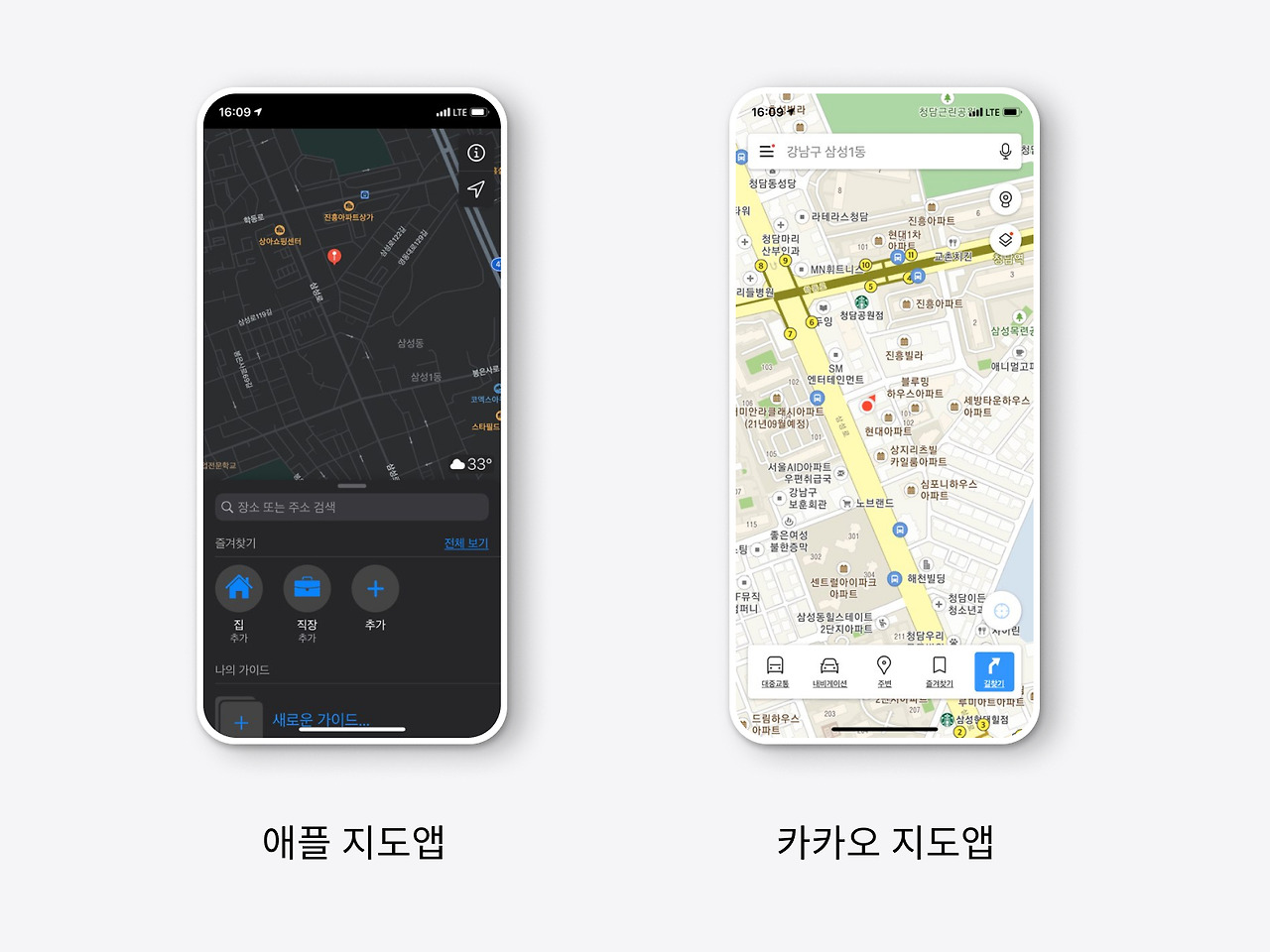 지도의 확대와 회전에서도 차이를 보여줍니다. 애플 지도는 한 번의 드래그로 360회전과 확대를 동시에 지원합니다. 반면 카카오 지도는 회전과 확대를 분리하여서 두 번 터치해야 되는 차이가 있습니다.(모르는 분이 많은데 두 손가락 드래그로 시점의 각도도 변경 가능합니다.)
