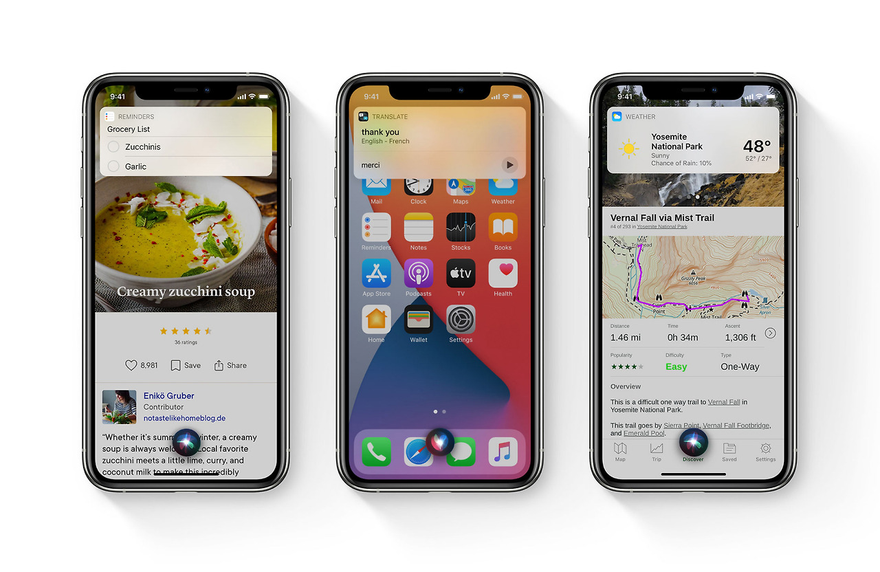 Siri의 모습은 새롭게 바뀌었습니다. 전체화면을 뒤덮지 않는 완전히 새로워진 디자인 덕분에 사용자는 더욱 편리하게 다양한 작업을 할 수 있게되었습니다. 하단의 3D모형의 시리아이콘이 뜨면서 요청한 내용도 상단의 알림으로 바뀌었습니다.